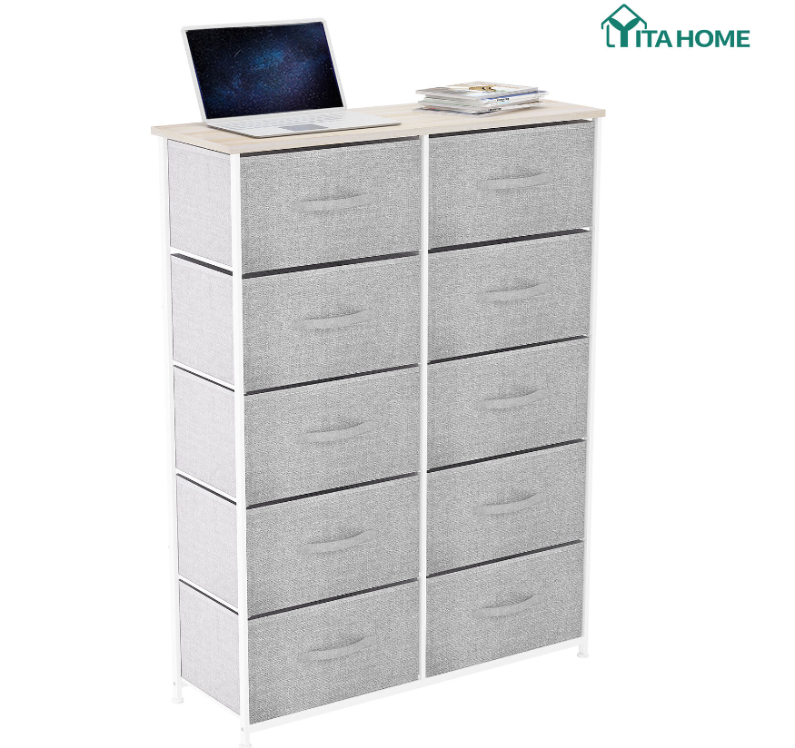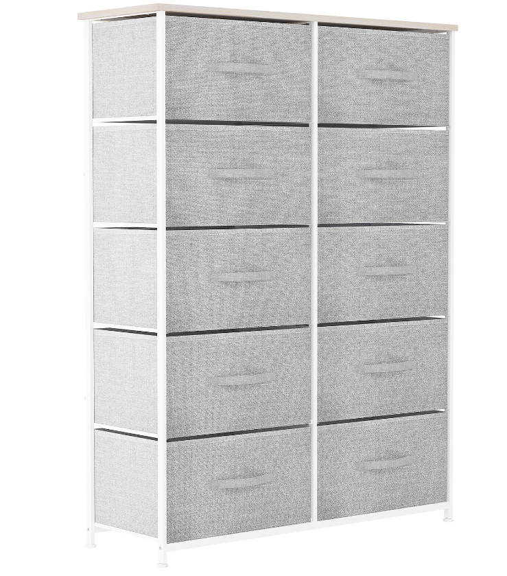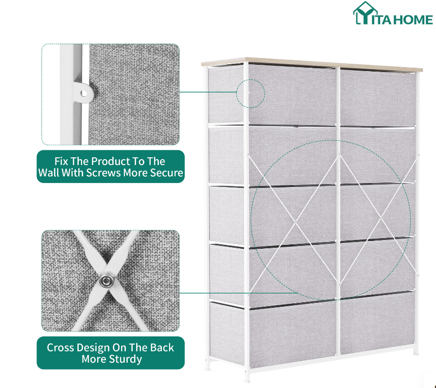 QUALITY CONSTRUCTION - Made with a powerful metal frame and durable MDF wooden top; contains 10 removable and foldable drawers with easy-to-pull fabric handles; features 4 adjustable plastic legs that prevent scratches to your floor.