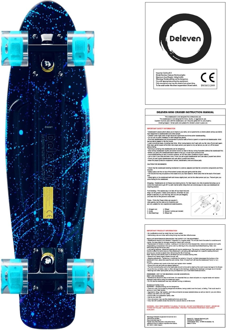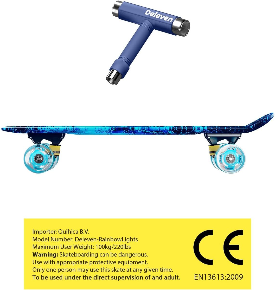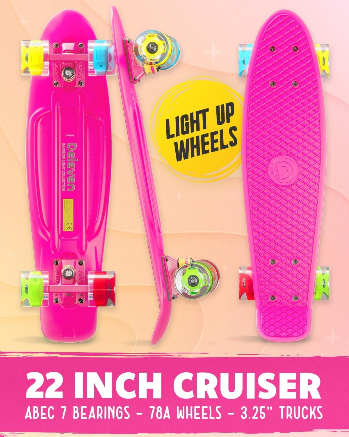 Deleven 22” Skateboard for Kids with Bright LED Wheels - Complete Gift Set with Carry Bag & Skate Tool - Mini Cruiser Retro Light Up Skateboard Made for Beginners, Girls & Boys
