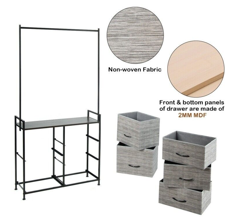This organizer has five drawers of different sizes to help you store clothes, toys, towels, etc. The hanging rod is wide enough to hang clothes and other accessories. Made of a sturdy steel tube and high-density materials, the entire organizer is stable and features a high weight-bearing capacity.