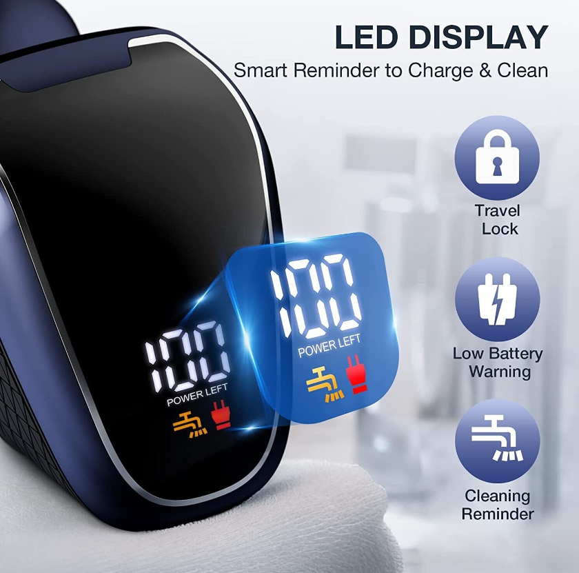 • 【LED Intelligent Display】The bald head shaver for men with LED display can accurately show the percentage of the battery power. Low battery reminder, water washing reminder more intelligent. Long press the switch button for 3 seconds to trigger the travel lock to avoid additional power consumption. This electric shaver uses 600mAh large-capacity battery, 1.5 hours of fast charging can provide 90 minutes of working time.