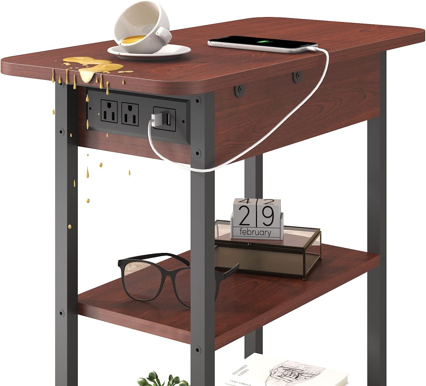 LIDYUK End Table with Charging Station, Flip Top Side Table with USB Ports and Outlets, Nightstand for Small Spaces, Bedside Tables with Storage Shelf for Living Room, Bedroom, Dark Cherry